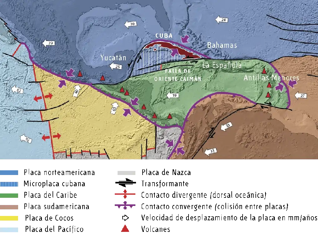 Se han representado los límites de las placas de la zona caribeña. Al norte se encuentra la placa norteamericana (azul); al sur la placa del Caribe (verde); entre las dos está la microplaca de Cuba (azul con rayas blancas) y más al sur la placa suramericana (marrón). Al oeste hay otra pequeña placa llamada de Cocos (amarillo) y más a poniente la gran placa pacífica (azul claro). Más al sur de la placa Cocos se encuentra la placa de Nazca (gris).