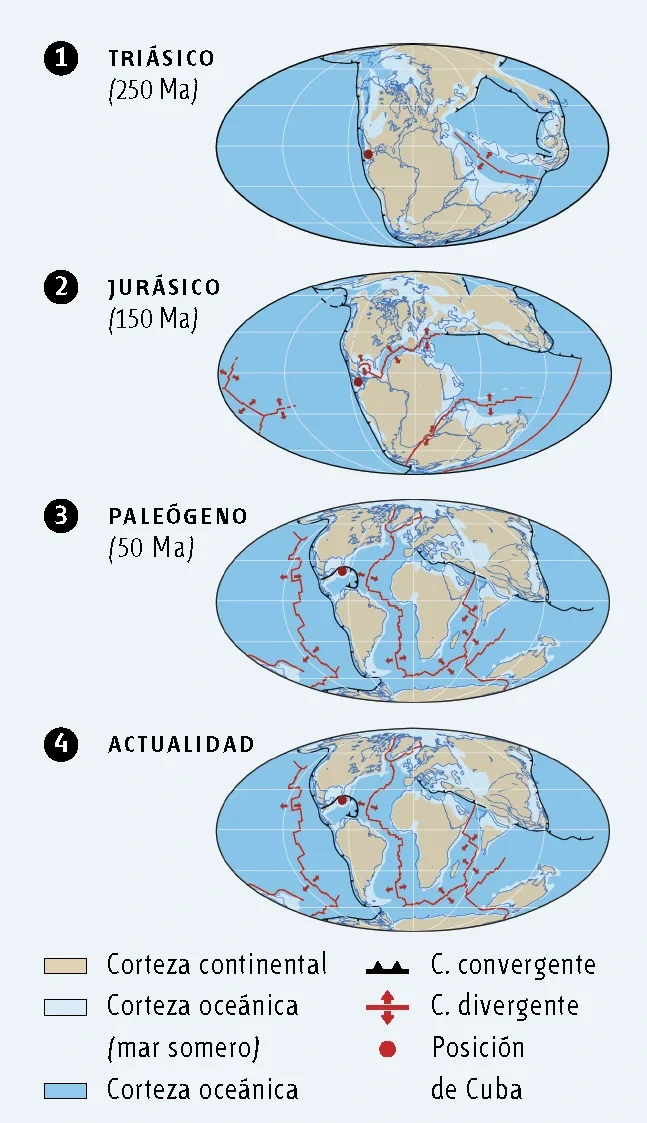 Para explicar el viaje de 2 000 km de Cuba desde el Pacífico hasta su situación actual, tenemos que retroceder unos 250 millones de años. En el Triásico (250 Ma) los continentes estaban todos unidos formando un supercontinente denominado Pangea. A inicios del Jurásico (150 Ma) empezó a abrirse el Atlántico formando dos supercontinentes: Laurasia, al norte, y Gondwana, al sur. Cuba estaría situada en el extremo occidental del límite de los dos supercontinentes. Poco a poco, se van separando nuevas placas y en el Paleógeno (50 Ma) ya se ha formado un mosaico de placas muy activas. Se puede observar el itinerario de la placa del Caribe con la geografía actual. Hace 120 Ma se situaba en la zona del Pacífico, poco a poco se fue trasladando hacia el este hasta su lugar actual. Cuba, formaba parte de la placa del Caribe, pero su trayectoria la llevó más hacia el noreste y colisionó con la placa norteamericana en concreto con la zona de Florida y Bahamas y se detuvo, mientras la placa del Caribe continúa su trayectoria hacia el este, hasta el lugar actual.