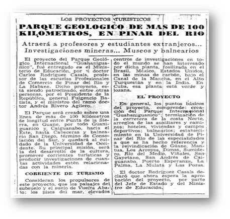 Curiosamente un primer intento de geoconservación de extraordinaria visión futurista, facilitó al Dr. Carlos Rodriguez Casals, diseñar el proyecto turístico «Parque Geológico Internacional Guaniguanico» que presentó al Ministerio de Educación en el año 1954. Más tarde se sucedieron varios investigadores que estudiaron el rico patrimonio geológico de la región.