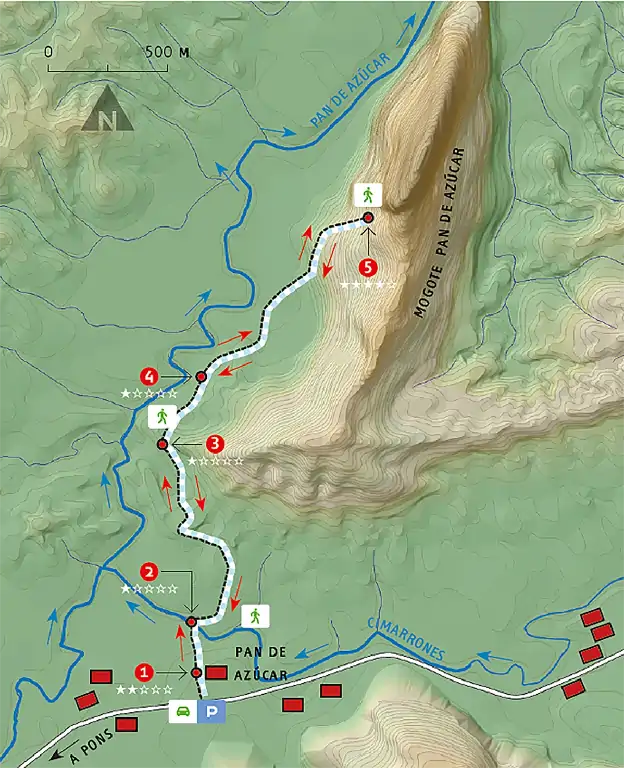 Para realizar este itinerario, hay que desplazarse, en un vehículo, hasta Pons (extremo occidental) y adentrarse por el Valle del Silencio en dirección noreste. Al final del valle se estaciona el vehículo y se sigue a pie hasta la loma occidental del mogote Pan de Azúcar. En este trayecto se puede disfrutar del paisaje singular y poco conocido del valle del Silencio y del mogote Pan de Azúcar. La senda cruza el río y asciende lentamente hasta la parte occidental de Pan de Azúcar, por un torrente empinado con numerosos ejemplares de «quesos» de carbonato cálcico y fósiles.
