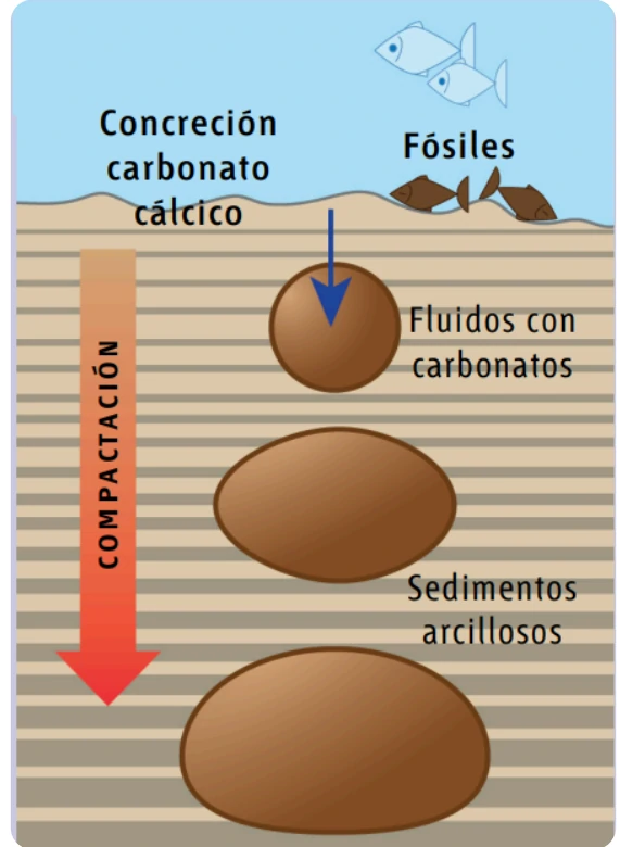 carbonato cálcico que se forman durante la diagénesis de los sedimentos. Estas rocas, en realidad son concreciones de carbonato cálcico que se forman durante la diagénesis de los sedimentos, es decir, la transformación de los sedimentos blandos del fondo del mar, en rocas. Se forman en cuencas marinas en donde abundan las arcillas, materiales poco permeables. Al compactarse los sedimentos arcillosos, la permeabilidad se reduce en la dirección vertical y origina concreciones de carbonato cálcico, formando esferas que van aumentando de volumen y que se deforman por el peso de los sedimentos, creando formas elípticas. La presencia de fosfatos y bacterias relacionadas con la descomposición de la materia orgánica facilitan la precipitación de estos carbonatos. Por este motivo es frecuente encontrar fósiles en el interior del «queso»