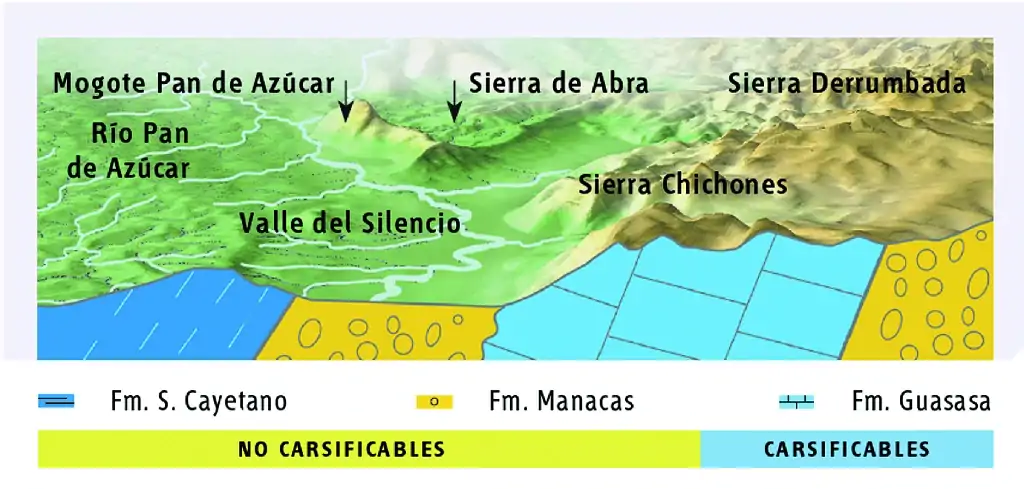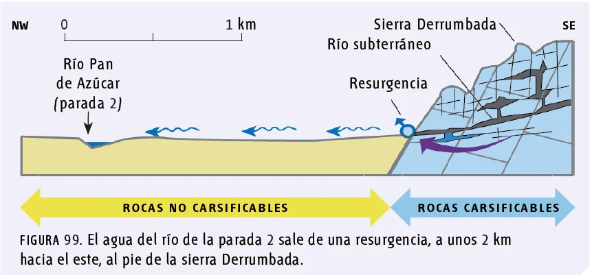 Recorrido de unos 5 km de ida y vuelta, cruce por el río Pan de Azúcar que ha emergido de la ladera norte de la Sierra Derrumbada responsable de la excavación de importantes sistemas cavernarios en esa región. Magníficas panorámicas de las sierras y mogotes. Abundantes concreciones calcáreas «quesos» con macrofósiles jurásicos.