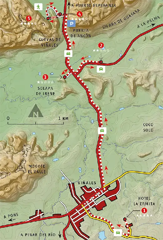 Desde el poblado de Viñales saldremos en dirección sur hacia el hotel La Ermita. A menos de 2 km se encuentra la entrada del hotel, seguimos en dirección norte y, pasada la piscina, se llega a un mirador. Se regresa a Viñales y se toma la carretera en dirección norte hasta llegar a la Puerta de Ancón. Por el camino se realizan dos paradas cercanas a la carretera.