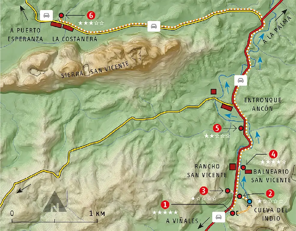 Este itinerario es la continuación del número 3. El atractivo principal de este itinerario es la visita a la cueva del Indio, en donde se puede pasear en barca por su río subterráneo. En las siguientes paradas se visita el centro hidrotermal del Rancho San Vicente y, en la zona norte, la impresionante muralla que forman los mogotes en La Costanera.