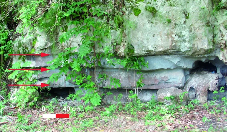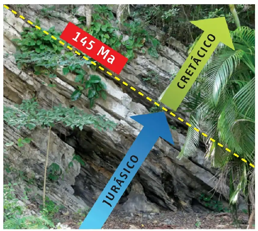 Llegamos a la carretera y la cruzamos hacia el lado occidental. A unos 50 metros un cartel nos indica que hay un afloramiento del «hipoestratotipo del Miembro El Americano”. Se trata del lugar en donde se definió esta unidad rocosa denominada Miembro «El Americano». Corresponde a la parte superior de la Formación Guasasa. Son calizas dolomíticas oscuras con una estratificación fina que puede ser centimétrica o decimétrica. En el afloramiento vemos claramente como las capas están inclinadas hacia el norte. Este nivel es muy importante para los geólogos porque es el contacto entre las rocas de Jurásico y el Cretácico Inferior (hace unos 145 Ma).