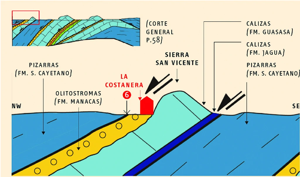 Pasados unos 5,5 km desde el entronque, llegamos al poblado de La Costanera, poco antes de que la carretera gire en dirección norte. A la derecha nos encontramos con un camino que asciende hasta un ranchón para actividades campesinas. Desde este punto un poco elevado, mirando hacia el sur, tenemos una magnífica e impresionante vista de la muralla de mogotes que forma la sierra de San Vicente. La misma se debe a que las rocas que afloran son las calizas masivas de la Formación Guasasa, difíciles de erosionar. En cambio, a nuestras espaldas, el relieve asciende más suavemente ya que las rocas aflorantes son las pizarras de la Formación San Cayetano.