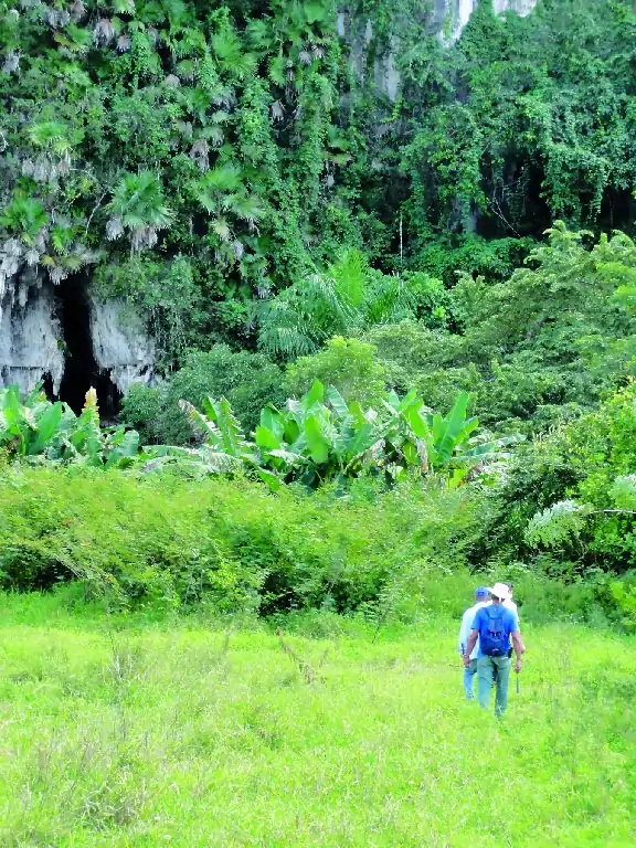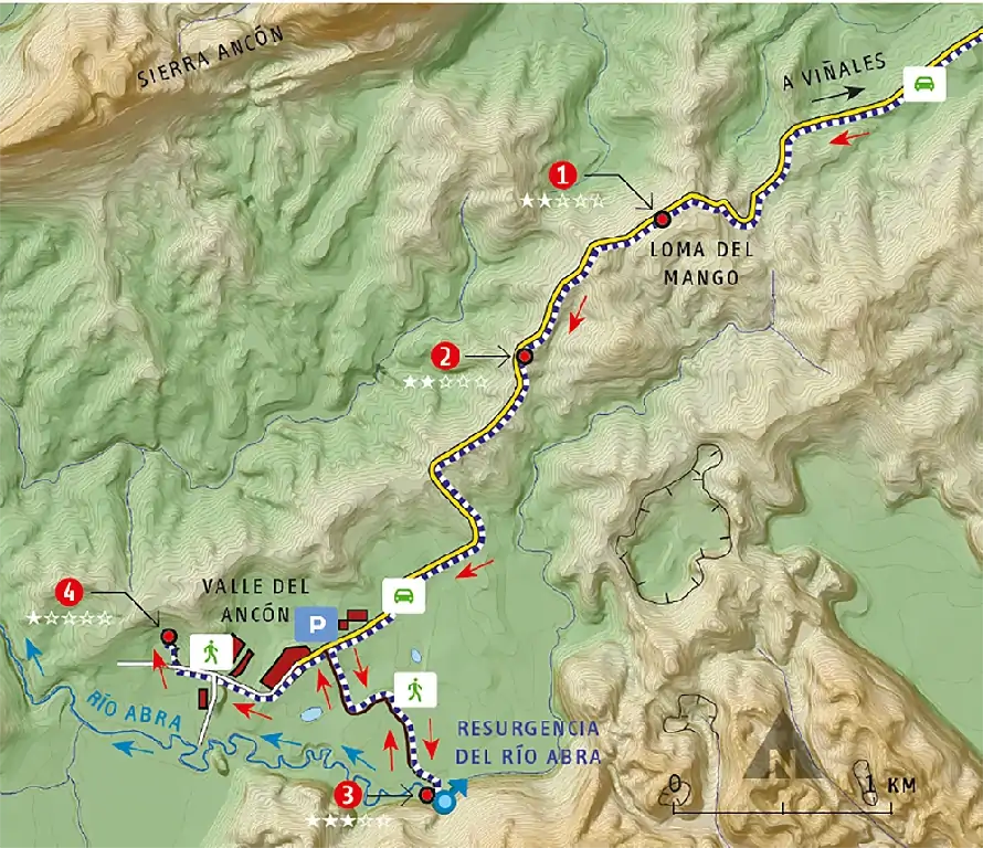 Itinerario por el valle de Ancón, con vistas a la sierra de Ancón y al abra que corta la sierra en dos partes. Se visita la entrada de la cueva resurgencia del río Abra. Este río subterráneo es la salida del río Palmarito que, en la otra parte de la sierra de Viñales y a más de 1,5 km, se hace subterráneo en el sumidero también llamado Palmarito.