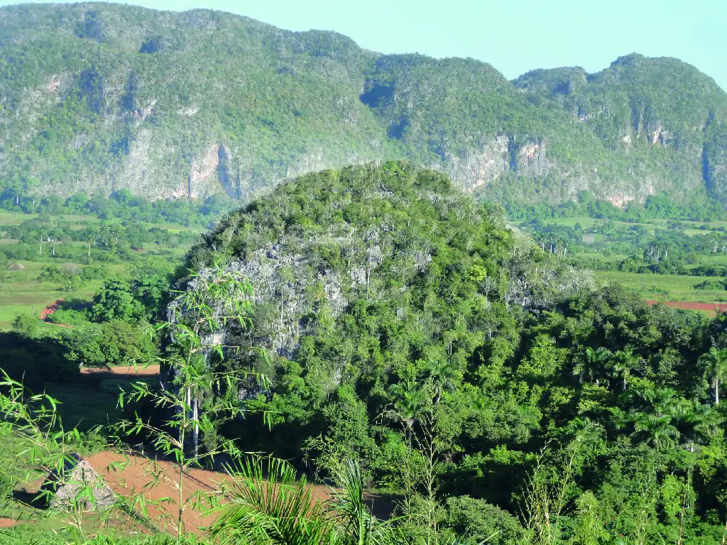 Vista del mogote aislado de Zacarías, descubrimiento increíble de un valle cerrado (Hoyo de Jaruco), cuevas con fósiles y pinturas rupestres.