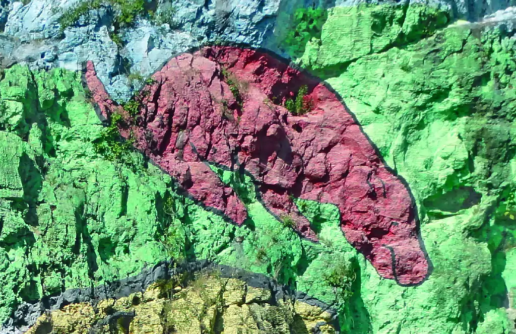 En el centro hay una zona pintada de color verde con tres figuras de animales. La superior de color rojo, representa un Acratocnus antillensis, un mamífero