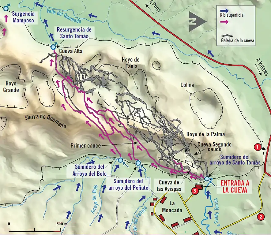 En la sierra del Quemado, existe una red de galerías subterráneas con un recorrido de unos 46 km. El río Santo Tomás y otros arroyos como el del Bolo y Peñate, fluyen por la superficie sobre rocas impermeables (Formación Manacas), pero al llegar a la mole de calizas de la Formación Guasasa se hacen subterráneos a través de diversos sumideros. Estos ríos subterráneos vuelven a surgir en el valle del Quemado en el lado occidental de la sierra del Quemado. Hace miles de años, se formaron los primeros ríos subterráneos los cuales quedaron abandonados cuando el nivel freático descendió. A lo largo del tiempo el nivel freático ha ido descendiendo, dejando galerías abandonadas en la parte superior. Actualmente se han cartografiado 7 niveles.El más moderno es el río subterráneo actual denominado «Primer nivel». Por encima se encuentra el «Segundo cauce» que tiene, habitualmente, agua en diversos sectores y que se inunda en las crecidas. Los 5 niveles superiores, son cada vez más antiguos y se les ha denominado: el 3, cueva de Mesa, el 4 cueva Antorchas, el 5, cueva Incógnita, el 6, cueva de las Avispas (el que se visita) y el superior y más antiguo la cueva Alta. Mapa simplificado de las galerías de la Gran Caverna de Santo Tomás, con un recorrido de 46 km en 7 niveles de cavernamiento. Los arroyos del sector este penetran por sumideros y resurgen en el valle del Quemado. Cortes con la evolución del sistema de Santo Tomás. Hay 7 niveles, los más antiguos son los superiores y los más modernos, los inferiores, marcadas por donde discurre el río subterráneo (escala vertical exagerada).