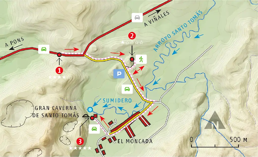 El itinerario se inicia en la carretera de Viñales a Pons, pocos metros después del en tronque con la localidad El Moncada. La primera parada es en la carretera para ver el límite K/ Pg, momento de la extinción de los dinosaurios, la segunda es una observación de rocas calizas y la tercera la visita de la Gran Caverna de Santo Tomás, más que una visita es una aventura espeleológica en una cueva en su estado natural.